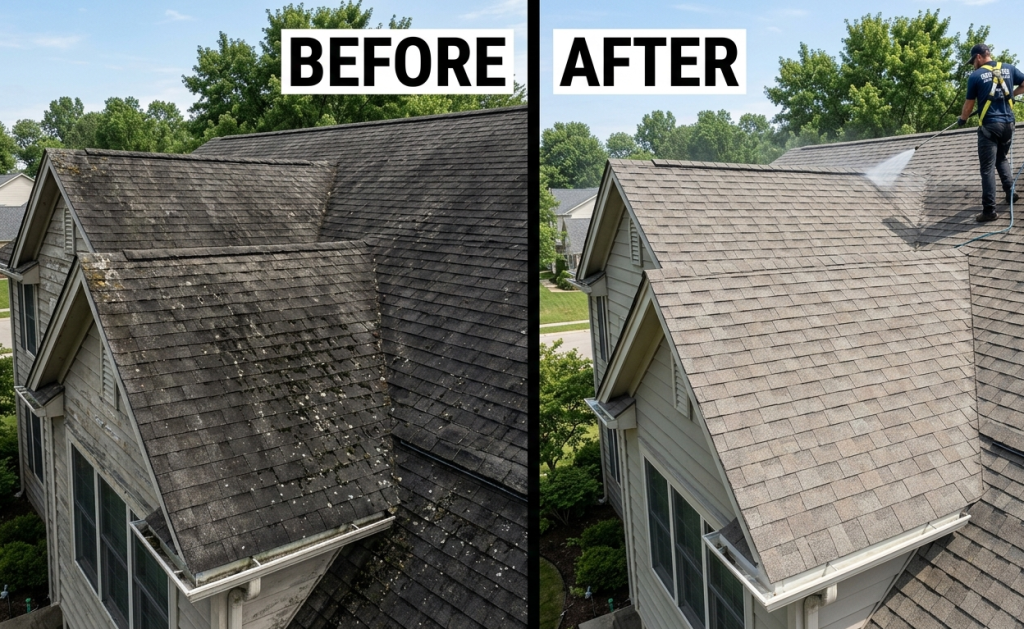 Soft wash roof cleaning uses a low-pressure application — typically under 100 PSI, compared to 1,500–3,000 PSI for a pressure washer — combined with a cleaning solution that kills the algae, moss, and mildew at the root. The solution does the work, not the pressure.